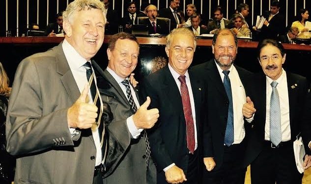 FOTO: Dirigentes da Frente Parlamentar da Agropecuária (FPA) comemoram a aprovação do projeto de lei da biodiversidade: o atual presidente, Luis Carlos Heinze (PP/RS); Valdir Colatto (PMDB/SC); o atual vice-presidente e presidente eleito 2015/2016, Marcos Montes (PSD/MG); o vice/região sul (e relator do texto aprovado) Alceu Moreira (PMDB/RS), Raimundo Gomes (PSDB/CE). O flagrante é do fotógrafo Cláudio Basílio de Araújo/Liderança do PSD