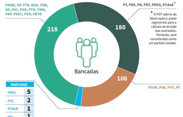Por esse critério, o principal bloco da Casa, liderado pelo PMDB e com 218 deputados, fará as três primeiras escolhas e terá nove comissões. O segundo maior bloco, que inclui o PT, ficará com sete. Já o bloco do PSDB presidirá cinco, enquanto o PDT, que só se integrou ao bloco liderado pelo PT após o prazo regimental para o cálculo da divisão das comissões, ficará com uma.