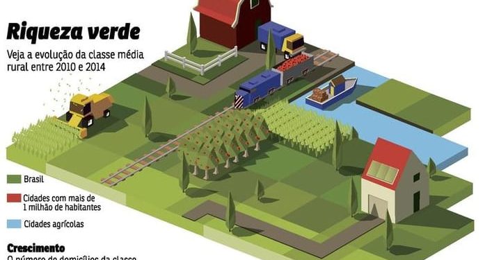 Esse processo levou ao enriquecimento de produtores rurais. Mas também à distribuição de renda nos municípios do campo, com a formação de uma classe média rural. O acesso à tecnologia exigiu a contratação de mão de obra capacitada, com melhores salários. Dados da consultoria Geofusion mostram que, nas cidades agrícolas, o número de domicílios do estrato sócioeconômico intermediário cresceu 39% entre 2010 e 2014. No Brasil, a expansão foi de 27% e, nas metrópoles com mais de 1 milhão de habitantes, a alta foi de 22%. A empresa classificou como residências desse segmento aquelas nas quais o orçamento familiar varia de R$ 1,9 mil a R$ 11 mil.
