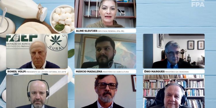 A Frente Parlamentar da Agropecuária realizou, nesta segunda-feira (3) debate sobre a cadeia produtiva do leite, no âmbito das políticas de garantia de renda para o setor. A live foi mediada pela deputada federal Aline Sleutjes (PSL-PR) e contou com a participação do diretor técnico da Emater-MG, Feliciano Nogueira; do diretor técnico da Embrapa-MG, Paulo Martins; do subsecretário de Política Agrícola do Ministério da Economia, Rogério Boueri; do representante do Ministério da Cidadania, Ênio Marques; do representante do Ministério da Agricultura, Márcio Madalena; e do representante da Câmara Setorial do Leite, Roneil Volpi.